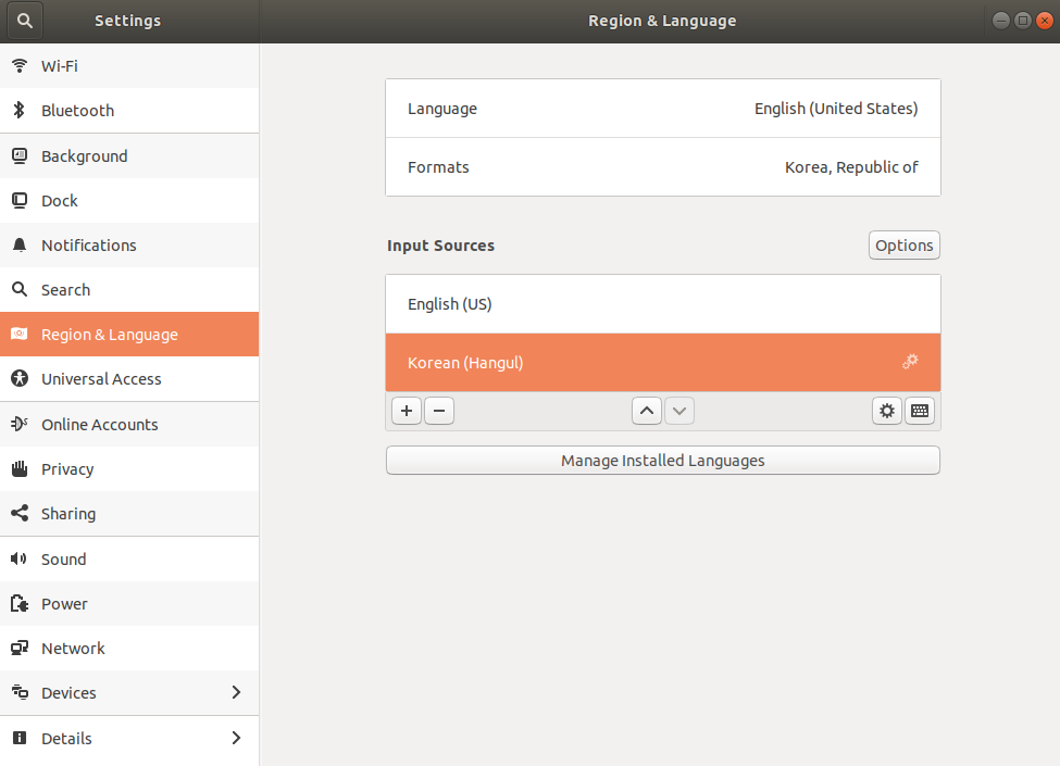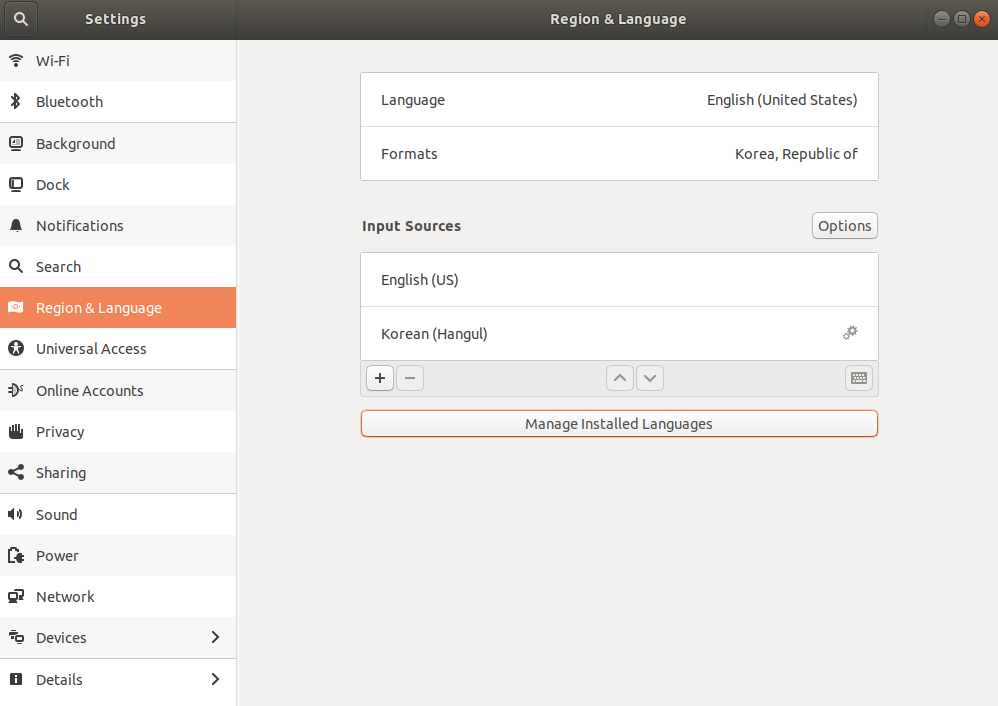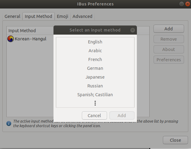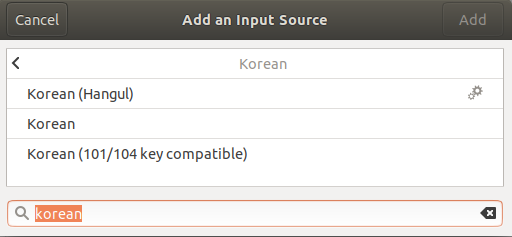 Input Method 탭 => Add 버튼을 선택=> Korean 검색=> Hangul 선택 =>Add